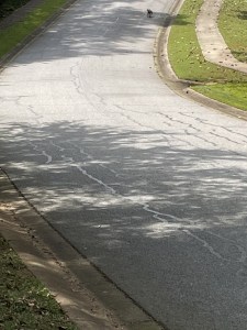 The other day I was taking my daily walk through our neighborhood. As I approached a stretch of road that passes a pond on the right side and a creek on the other, I saw a pretty fox standing serenely in my path. I’m used to wildlife frolicking in the water-rich area. Snakes cross frequently, and once a doe nearly ran me over trying to get to the pond for a drink. The fox was new. Thinking the fox would run off as I approached, I maintained my steady pace towards him/her. When I got about twenty-five feet away, I realized the fox stood motionless, completely unperturbed by me. I slowed. I stopped and took a picture. Pardon the quality; I really didn’t want to get too close. Doesn’t he/she look ferocious? I think something had to be wrong, like Rabies, or he/she would have run. Anyway, I turned and retraced my steps to home. My husband and sons laughed at me. So unfair.